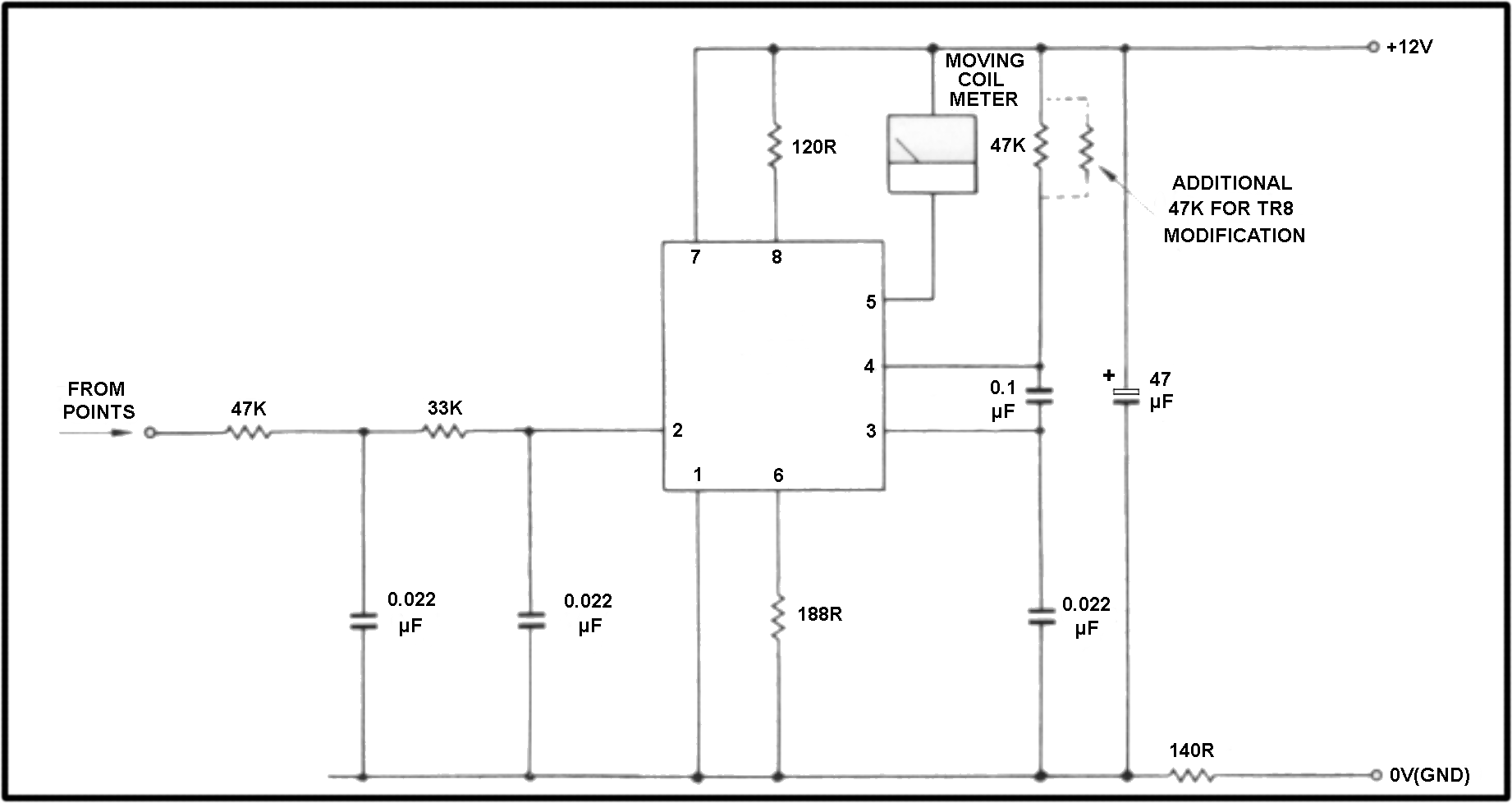 The original TR8 tacho (BL Part No. TKC 2587) is no longer available. However, it is possible to convert the standard TR7 tacho for use in the TR8, the cost of the conversion being less than £5 in parts. This conversion should be well within the scope of most people, provided that it is done with care and in a good working environment.