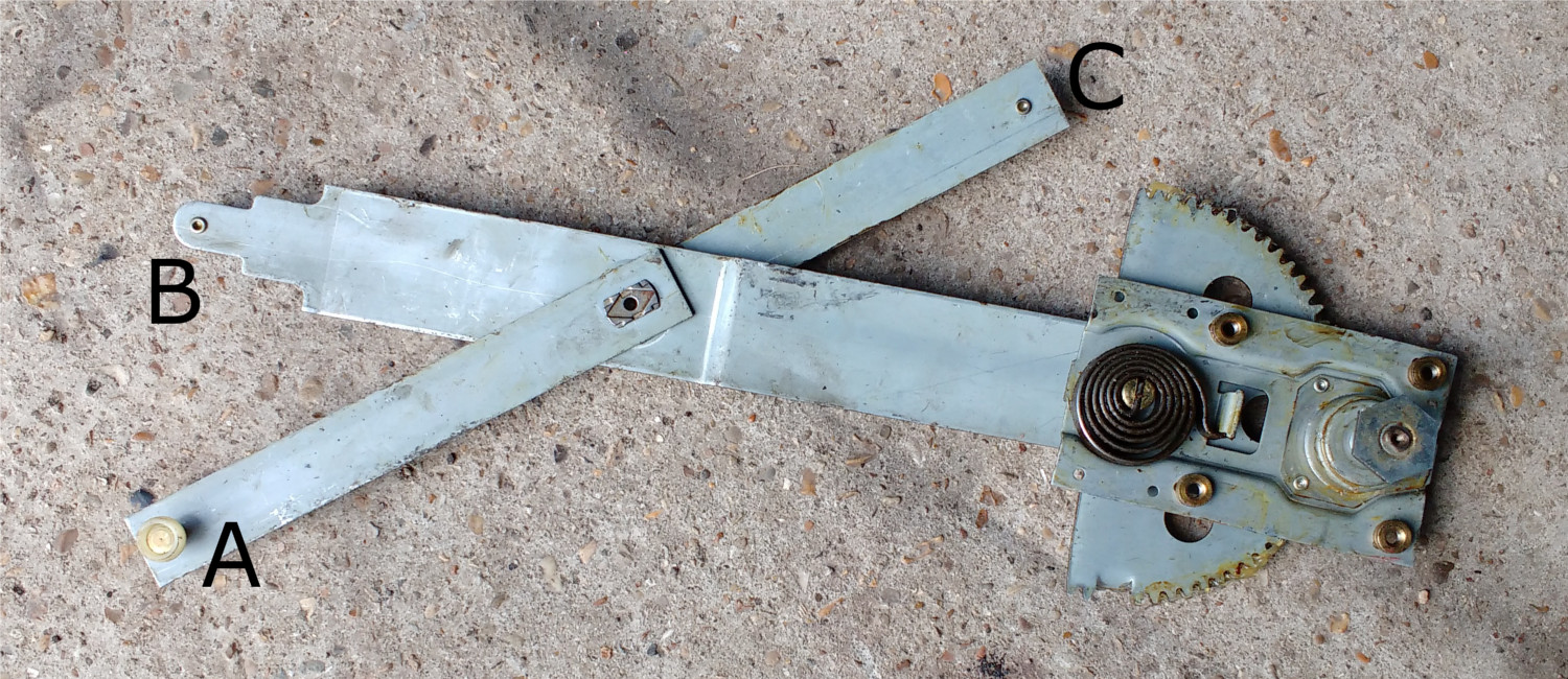 Carefully continue to slide both black rollers, that are now engaged in their respective channels, toward the rear of the door and at the same time raise the handle end of the winding assembly.Slide the assembly so that the white roller "A" can be engaged on the rear of the channel attached to the inside of the door. You may need another pair of hands to lower the door glass at this point but I managed it with the glass clamped at the top of the door.